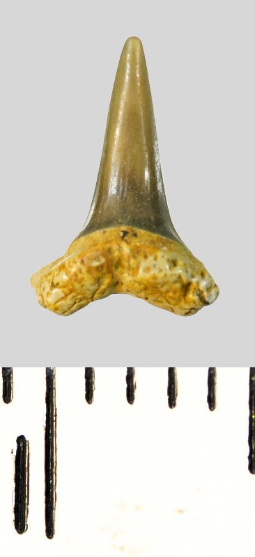Мелкий боковой зуб с коронкой серого цвета, колюще-режущего типа, S-образно изогнутой, с гладким режущим краем. С лингвальной стороны у основания коронки на эмали имеется скульптура в виде слабой продольной струйчатости. Корень охристый, арочный, умеренно массивный, со следами окатанности. Имеется одна питательная борозда с лингвальной стороны корня. Добавочные зубцы коронки отсутствуют.