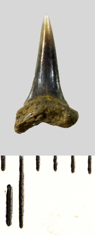 Мелкий боковой зуб с коронкой серого цвета, колюще-режущего типа, S-образно изогнутой, с гладким режущим краем. С лингвальной стороны у основания коронки на эмали имеется скульптура в виде слабой продольной струйчатости. Корень охристый, арочный, умеренно массивный, со следами окатанности. Имеется одна питательная борозда с лингвальной стороны корня. Добавочные зубцы коронки отсутствуют.