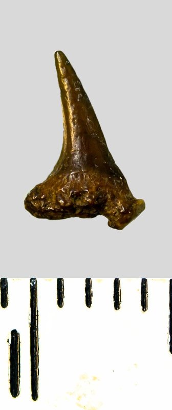 Зуб (фрагмент). Акула. Eostriatolamia subulata (Agassiz, 1843). Классификация: Хордовые Chordata, Позвоночные Vertebrata, Хрящевые рыбы Chondrichthyes, Пластиножаберные Elasmobranchii, Акулы Selachii, Ламнообразные Lamniformes, Песчаные акулы Odontaspididae