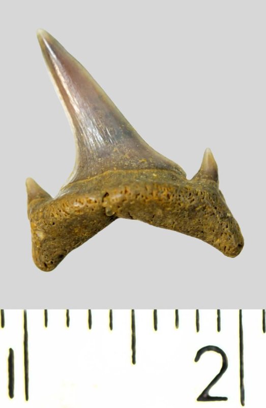 Мелкий боковой зуб с коронкой серого цвета, колюще-режущего типа, S-образно изогнутой, с гладким режущим краем. С лингвальной стороны у основания коронки на эмали имеется скульптура в виде слабой продольной струйчатости. Корень охристый, арочный, умеренно массивный, со следами окатанности. С лингвальной стороны корня одна питательная борозда. Присутствует одна пара добавочных зубцов коронки.