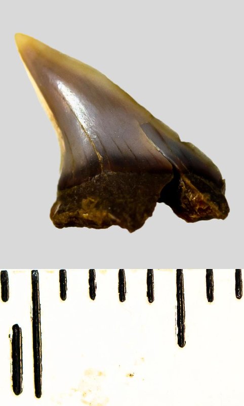 Зуб (фрагмент). Акула. Lamniformes gen. indet. Классификация: Хордовые Chordata, Позвоночные Vertebrata, Хрящевые рыбы Chondrichthyes, Пластиножаберные Elasmobranchii, Акулы Selachii, Ламнообразные Lamniformes