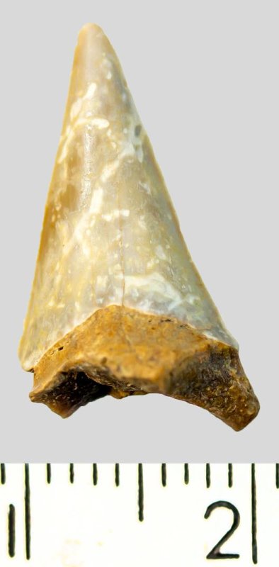 Зуб (фрагмент). Акула. Cretoxyrhina denticulata (Glueckman, 1957). Классификация: Хордовые Chordata, Позвоночные Vertebrata, Хрящевые рыбы Chondrichthyes, Пластиножаберные Elasmobranchii, Акулы Selachii, Ламнообразные Lamniformes, Cretoxyrhinidae