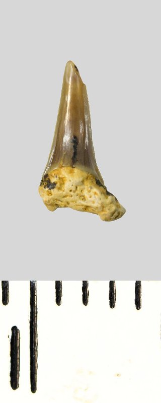 Зуб. Акула. Eostriatolamia subulata (Agassiz, 1843). Классификация: Хордовые Chordata, Позвоночные Vertebrata, Хрящевые рыбы Chondrichthyes, Пластиножаберные Elasmobranchii, Акулы Selachii, Ламнообразные Lamniformes, Песчаные акулы Odontaspididae