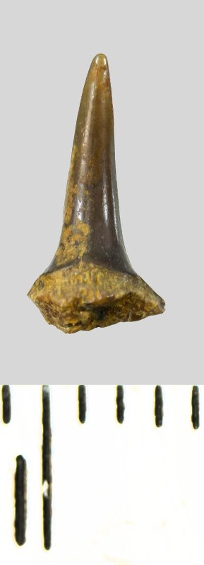 Зуб (фрагмент). Акула. Eostriatolamia subulata (Agassiz, 1843). Классификация: Хордовые Chordata, Позвоночные Vertebrata, Хрящевые рыбы Chondrichthyes, Пластиножаберные Elasmobranchii, Акулы Selachii, Ламнообразные Lamniformes, Песчаные акулы Odontaspididae