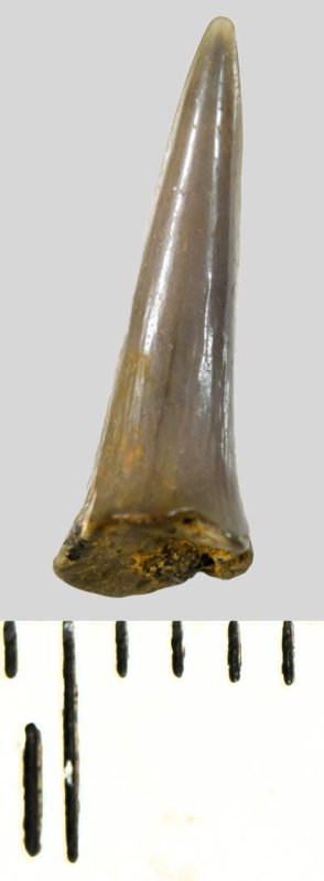 Зуб (фрагмент). Акула. Eostriatolamia subulata (Agassiz, 1843). Классификация: Хордовые Chordata, Позвоночные Vertebrata, Хрящевые рыбы Chondrichthyes, Пластиножаберные Elasmobranchii, Акулы Selachii, Ламнообразные Lamniformes, Песчаные акулы Odontaspididae