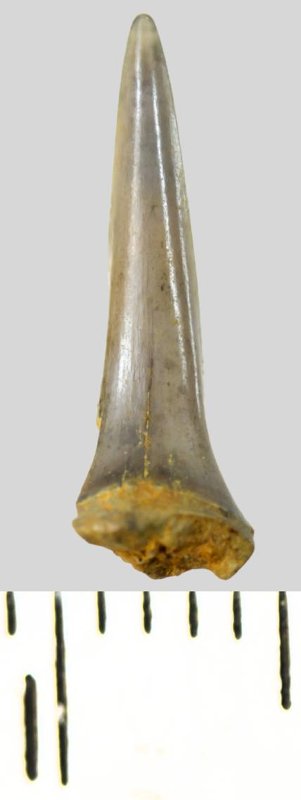 Зуб (фрагмент). Акула. Eostriatolamia subulata (Agassiz, 1843). Классификация: Хордовые Chordata, Позвоночные Vertebrata, Хрящевые рыбы Chondrichthyes, Пластиножаберные Elasmobranchii, Акулы Selachii, Ламнообразные Lamniformes, Песчаные акулы Odontaspididae