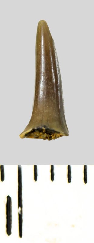 Коронка мелкого бокового зуба серого цвета, колюще-режущего типа, S-образно изогнутая, с гладким режущим краем. С лингвальной стороны у основания коронки на эмали имеется скульптура в виде слабой продольной струйчатости. Корень не сохранился
