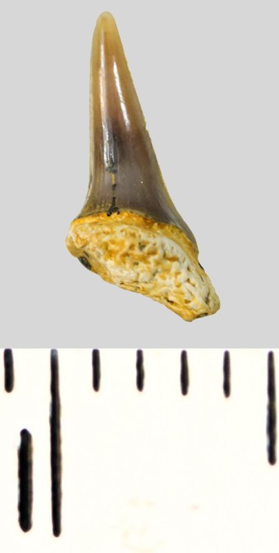 Зуб. Акула. Eostriatolamia subulata (Agassiz, 1843). Классификация: Хордовые Chordata, Позвоночные Vertebrata, Хрящевые рыбы Chondrichthyes, Пластиножаберные Elasmobranchii, Акулы Selachii, Ламнообразные Lamniformes, Песчаные акулы Odontaspididae