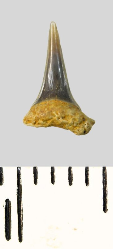 Зуб. Акула. Eostriatolamia subulata (Agassiz, 1843). Классификация: Хордовые Chordata, Позвоночные Vertebrata, Хрящевые рыбы Chondrichthyes, Пластиножаберные Elasmobranchii, Акулы Selachii, Ламнообразные Lamniformes, Песчаные акулы Odontaspididae