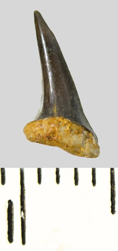 Зуб (фрагмент). Акула. Eostriatolamia subulata (Agassiz, 1843). Классификация: Хордовые Chordata, Позвоночные Vertebrata, Хрящевые рыбы Chondrichthyes, Пластиножаберные Elasmobranchii, Акулы Selachii, Ламнообразные Lamniformes, Песчаные акулы Odontaspididae
