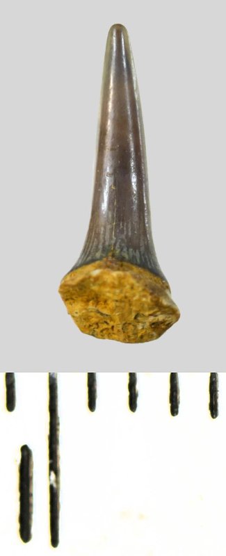 Зуб (фрагмент). Акула. Eostriatolamia subulata (Agassiz, 1843). Классификация: Хордовые Chordata, Позвоночные Vertebrata, Хрящевые рыбы Chondrichthyes, Пластиножаберные Elasmobranchii, Акулы Selachii, Ламнообразные Lamniformes, Песчаные акулы Odontaspididae