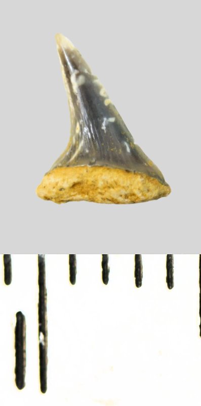 Зуб (фрагмент). Акула. Eostriatolamia subulata (Agassiz, 1843). Классификация: Хордовые Chordata, Позвоночные Vertebrata, Хрящевые рыбы Chondrichthyes, Пластиножаберные Elasmobranchii, Акулы Selachii, Ламнообразные Lamniformes, Песчаные акулы Odontaspididae