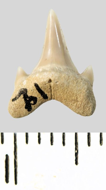 Зуб. Акула. Archaeolamna cf. kopingensis (Davis, 1890). Классификация: Хордовые Chordata, Позвоночные Vertebrata, Хрящевые рыбы Chondrichthyes, Пластиножаберные Elasmobranchii, Акулы Selachii, Ламнообразные Lamniformes