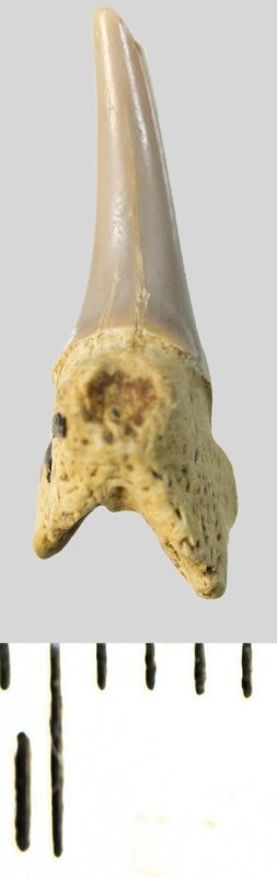 Зуб. Акула. Protolamna sp.? Классификация: Хордовые Chordata, Позвоночные Vertebrata, Хрящевые рыбы Chondrichthyes, Пластиножаберные Elasmobranchii, Акулы Selachii, Ламнообразные Lamniformes