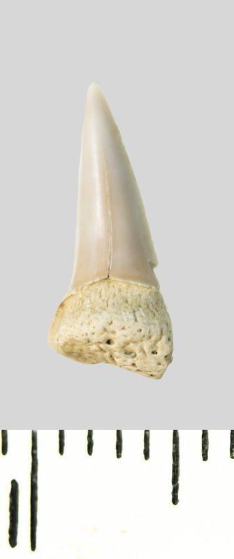 Зуб (фрагмент). Акула. Lamniformes gen. indet. Классификация: Хордовые Chordata, Позвоночные Vertebrata, Хрящевые рыбы Chondrichthyes, Пластиножаберные Elasmobranchii, Акулы Selachii, Ламнообразные Lamniformes