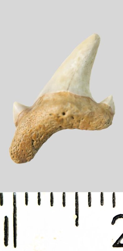 Зуб. Акула. Archaeolamna cf. kopingensis (Davis, 1890). Классификация: Хордовые Chordata, Позвоночные Vertebrata, Хрящевые рыбы Chondrichthyes, Пластиножаберные Elasmobranchii, Акулы Selachii, Ламнообразные Lamniformes