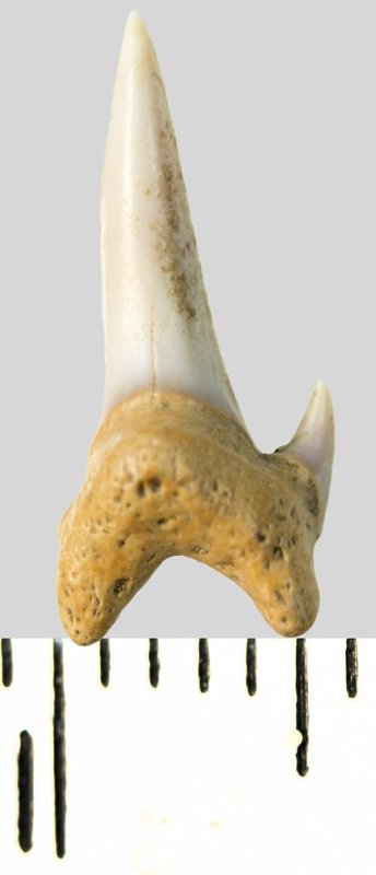 Зуб. Акула. Archaeolamna cf. kopingensis (Davis, 1890). Классификация: Хордовые Chordata, Позвоночные Vertebrata, Хрящевые рыбы Chondrichthyes, Пластиножаберные Elasmobranchii, Акулы Selachii, Ламнообразные Lamniformes