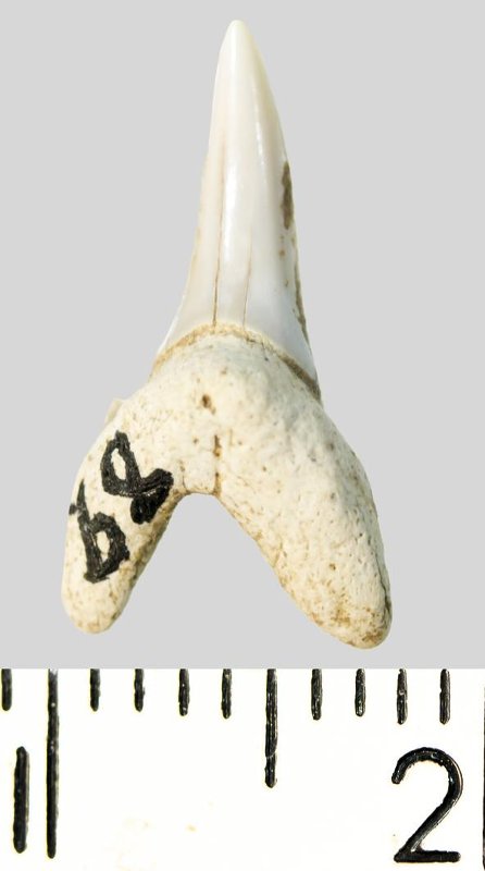 Зуб. Акула. Archaeolamna cf. kopingensis (Davis, 1890). Классификация: Хордовые Chordata, Позвоночные Vertebrata, Хрящевые рыбы Chondrichthyes, Пластиножаберные Elasmobranchii, Акулы Selachii, Ламнообразные Lamniformes