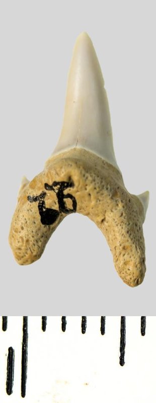 Зуб. Акула. Archaeolamna cf. kopingensis (Davis, 1890). Классификация: Хордовые Chordata, Позвоночные Vertebrata, Хрящевые рыбы Chondrichthyes, Пластиножаберные Elasmobranchii, Акулы Selachii, Ламнообразные Lamniformes