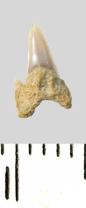 Зуб. Акула. Eostriatolamia subulata (Agassiz, 1843). Классификация: Хордовые Chordata, Позвоночные Vertebrata, Хрящевые рыбы Chondrichthyes, Пластиножаберные Elasmobranchii, Акулы Selachii, Ламнообразные Lamniformes