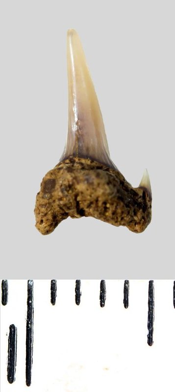 Зуб. Акула. Eostriatolamia subulata (Agassiz, 1843). Классификация: Хордовые Chordata, Позвоночные Vertebrata, Хрящевые рыбы Chondrichthyes, Пластиножаберные Elasmobranchii, Акулы Selachii, Ламнообразные Lamniformes