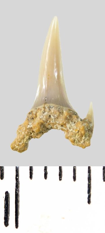 Зуб. Акула. Eostriatolamia subulata (Agassiz, 1843). Классификация: Хордовые Chordata, Позвоночные Vertebrata, Хрящевые рыбы Chondrichthyes, Пластиножаберные Elasmobranchii, Акулы Selachii, Ламнообразные Lamniformes
