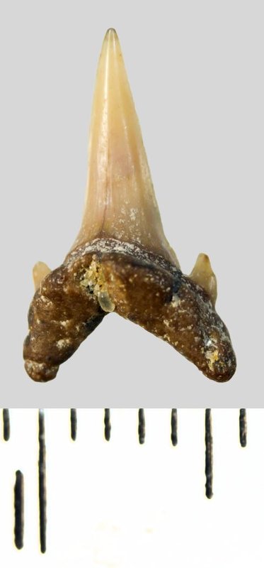 Зуб. Акула. Eostriatolamia subulata (Agassiz, 1843). Классификация: Хордовые Chordata, Позвоночные Vertebrata, Хрящевые рыбы Chondrichthyes, Пластиножаберные Elasmobranchii, Акулы Selachii, Ламнообразные Lamniformes