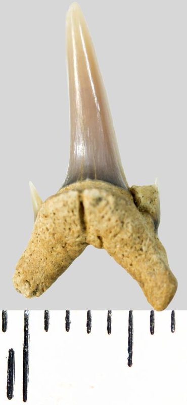Зуб. Акула. Eostriatolamia subulata (Agassiz, 1843). Классификация: Хордовые Chordata, Позвоночные Vertebrata, Хрящевые рыбы Chondrichthyes, Пластиножаберные Elasmobranchii, Акулы Selachii, Ламнообразные Lamniformes