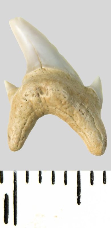 Зуб. Акула. Archaeolamna cf. kopingensis (Davis, 1890). Классификация: Хордовые Chordata, Позвоночные Vertebrata, Хрящевые рыбы Chondrichthyes, Пластиножаберные Elasmobranchii, Акулы Selachii, Ламнообразные Lamniformes