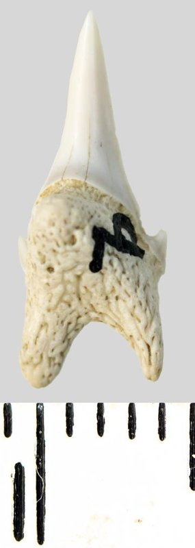 Зуб. Акула. Archaeolamna cf. kopingensis (Davis, 1890). Классификация: Хордовые Chordata, Позвоночные Vertebrata, Хрящевые рыбы Chondrichthyes, Пластиножаберные Elasmobranchii, Акулы Selachii, Ламнообразные Lamniformes