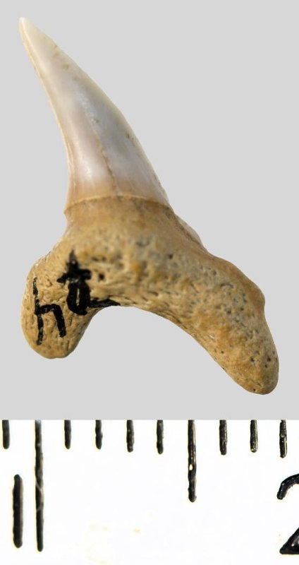Зуб. Акула. Protolamna sp.? Классификация: Хордовые Chordata, Позвоночные Vertebrata, Хрящевые рыбы Chondrichthyes, Пластиножаберные Elasmobranchii, Акулы Selachii, Ламнообразные Lamniformes