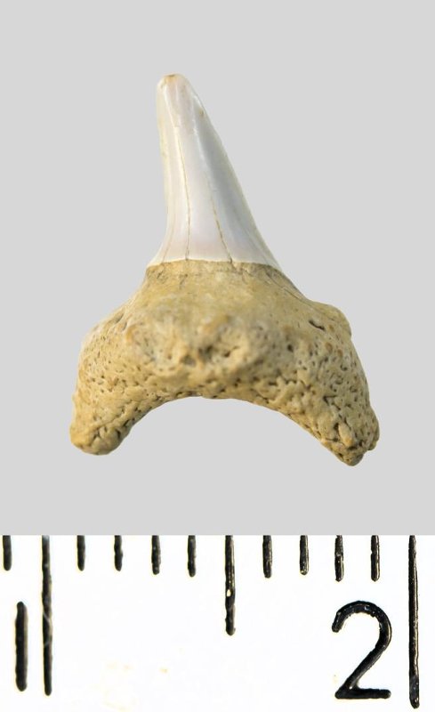 Зуб. Акула. Protolamna sp.? Классификация: Хордовые Chordata, Позвоночные Vertebrata, Хрящевые рыбы Chondrichthyes, Пластиножаберные Elasmobranchii, Акулы Selachii, Ламнообразные Lamniformes