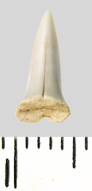 Зуб (фрагмент). Акула. Lamniformes gen. indet. Классификация: Хордовые Chordata, Позвоночные Vertebrata, Хрящевые рыбы Chondrichthyes, Пластиножаберные Elasmobranchii, Акулы Selachii, Ламнообразные Lamniformes