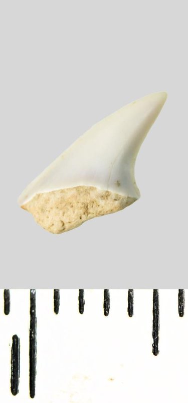 Зуб (фрагмент). Акула. Lamniformes gen. indet. Классификация: Хордовые Chordata, Позвоночные Vertebrata, Хрящевые рыбы Chondrichthyes, Пластиножаберные Elasmobranchii, Акулы Selachii, Ламнообразные Lamniformes