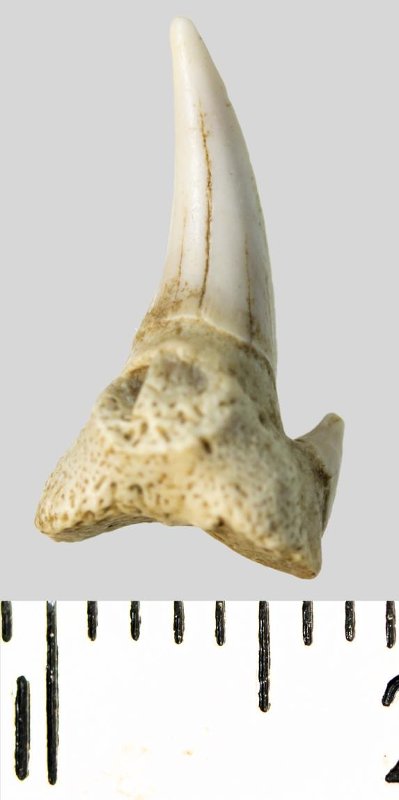 Зуб (фрагмент). Акула. Lamniformes gen. indet. Классификация: Хордовые Chordata, Позвоночные Vertebrata, Хрящевые рыбы Chondrichthyes, Пластиножаберные Elasmobranchii, Акулы Selachii, Ламнообразные Lamniformes