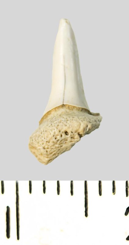 Зуб (фрагмент). Акула. Lamniformes gen. indet. Классификация: Хордовые Chordata, Позвоночные Vertebrata, Хрящевые рыбы Chondrichthyes, Пластиножаберные Elasmobranchii, Акулы Selachii, Ламнообразные Lamniformes