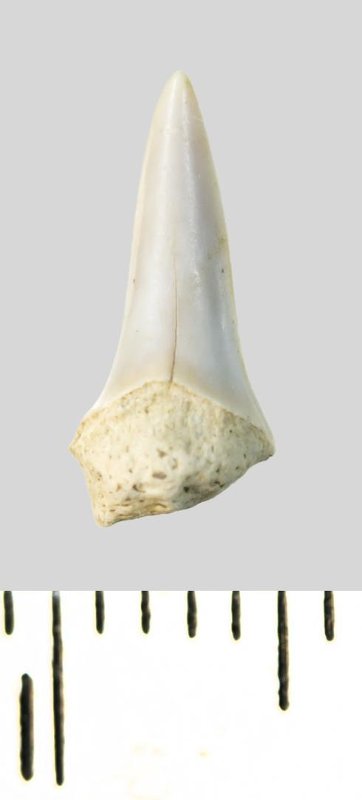 Зуб (фрагмент). Акула. Lamniformes gen. indet. Классификация: Хордовые Chordata, Позвоночные Vertebrata, Хрящевые рыбы Chondrichthyes, Пластиножаберные Elasmobranchii, Акулы Selachii, Ламнообразные Lamniformes