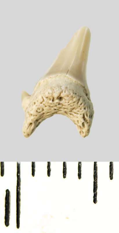 Зуб. Акула. Archaeolamna cf. kopingensis (Davis, 1890). Классификация: Хордовые Chordata, Позвоночные Vertebrata, Хрящевые рыбы Chondrichthyes, Пластиножаберные Elasmobranchii, Акулы Selachii, Ламнообразные Lamniformes