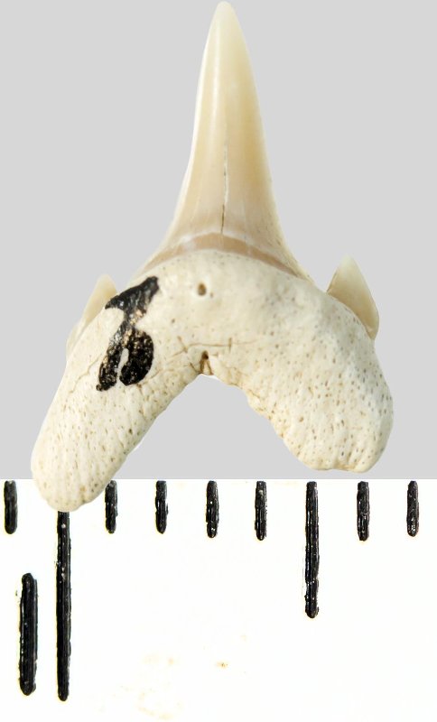 Зуб. Акула. Archaeolamna cf. kopingensis (Davis, 1890). Классификация: Хордовые Chordata, Позвоночные Vertebrata, Хрящевые рыбы Chondrichthyes, Пластиножаберные Elasmobranchii, Акулы Selachii, Ламнообразные Lamniformes