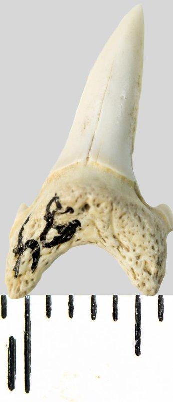 Зуб. Акула. Archaeolamna cf. kopingensis (Davis, 1890). Классификация: Хордовые Chordata, Позвоночные Vertebrata, Хрящевые рыбы Chondrichthyes, Пластиножаберные Elasmobranchii, Акулы Selachii, Ламнообразные Lamniformes