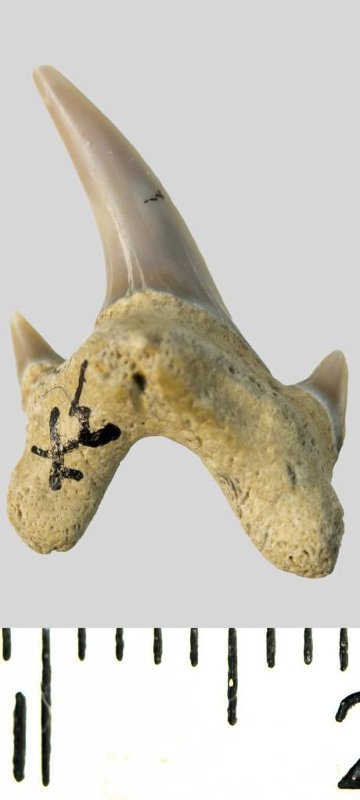 Зуб. Акула. Protolamna cf. sokolovi Capetta, 1980. Классификация: Хордовые Chordata, Позвоночные Vertebrata, Хрящевые рыбы Chondrichthyes, Пластиножаберные Elasmobranchii, Акулы Selachii, Ламнообразные Lamniformes