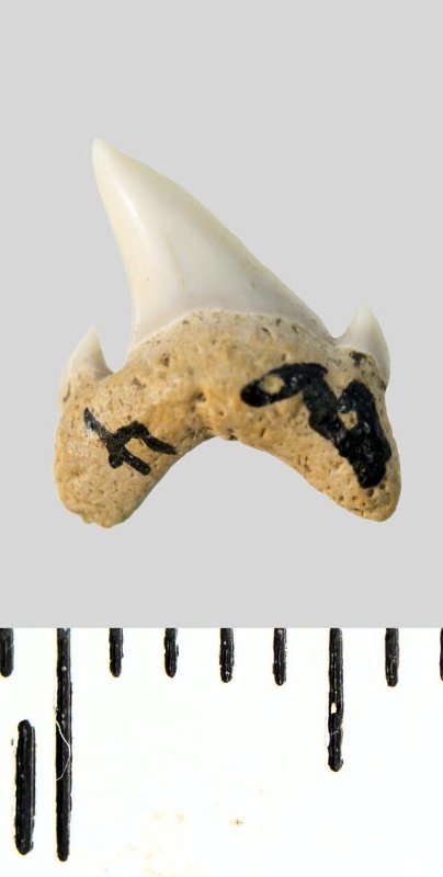 Зуб. Акула. Eostriatolamia subulata (Agassiz, 1843). Классификация: Хордовые Chordata, Позвоночные Vertebrata, Хрящевые рыбы Chondrichthyes, Пластиножаберные Elasmobranchii, Акулы Selachii, Ламнообразные Lamniformes