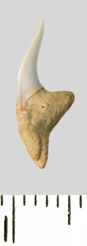 Зуб. Акула. Pseudoscapanorhynchus compressidens ( Herman 1977). Классификация: Хордовые Chordata, Позвоночные Vertebrata, Хрящевые рыбы Chondrichthyes, Пластиножаберные Elasmobranchii, Акулы Selachii, Ламнообразные Lamniformes