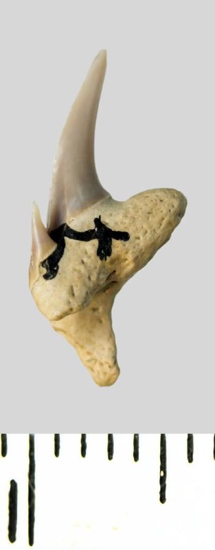 Зуб. Акула. Pseudoscapanorhynchus compressidens ( Herman 1977). Классификация: Хордовые Chordata, Позвоночные Vertebrata, Хрящевые рыбы Chondrichthyes, Пластиножаберные Elasmobranchii, Акулы Selachii, Ламнообразные Lamniformes