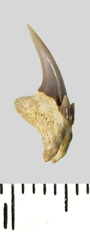 Зуб. Акула. Pseudoscapanorhynchus compressidens ( Herman 1977). Классификация: Хордовые Chordata, Позвоночные Vertebrata, Хрящевые рыбы Chondrichthyes, Пластиножаберные Elasmobranchii, Акулы Selachii, Ламнообразные Lamniformes