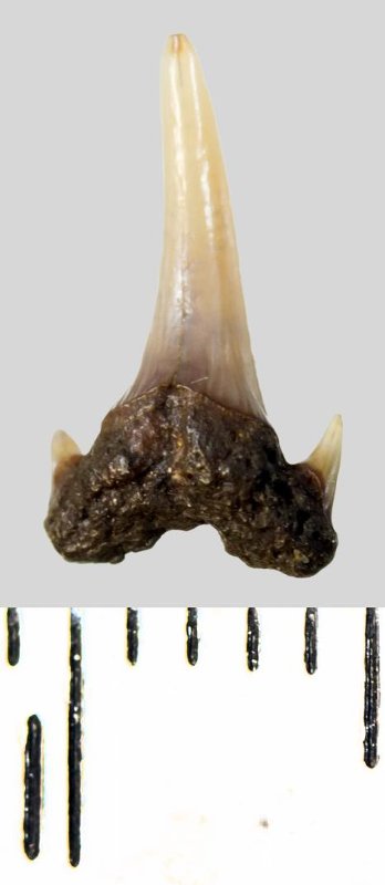Зуб. Акула. Eostriatolamia subulata (Agassiz, 1843). Классификация: Хордовые Chordata, Позвоночные Vertebrata, Хрящевые рыбы Chondrichthyes, Пластиножаберные Elasmobranchii, Акулы Selachii, Ламнообразные Lamniformes
