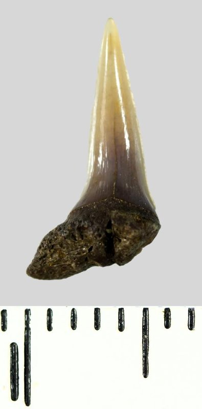 Зуб (фрагмент). Акула. Lamniformes gen. et sp. indet. Классификация: Хордовые Chordata, Позвоночные Vertebrata, Хрящевые рыбы Chondrichthyes, Пластиножаберные Elasmobranchii, Акулы Selachii, Ламнообразные Lamniformes