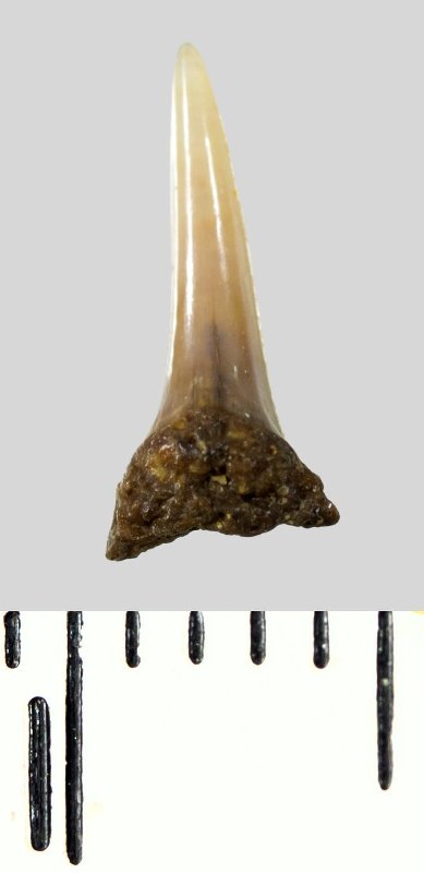 Зуб (фрагмент). Акула. Lamniformes gen. et sp. indet. Классификация: Хордовые Chordata, Позвоночные Vertebrata, Хрящевые рыбы Chondrichthyes, Пластиножаберные Elasmobranchii, Акулы Selachii, Ламнообразные Lamniformes