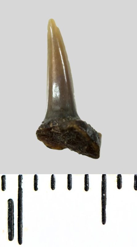 Зуб (фрагмент). Акула. Lamniformes gen. et sp. indet. Классификация: Хордовые Chordata, Позвоночные Vertebrata, Хрящевые рыбы Chondrichthyes, Пластиножаберные Elasmobranchii, Акулы Selachii, Ламнообразные Lamniformes
