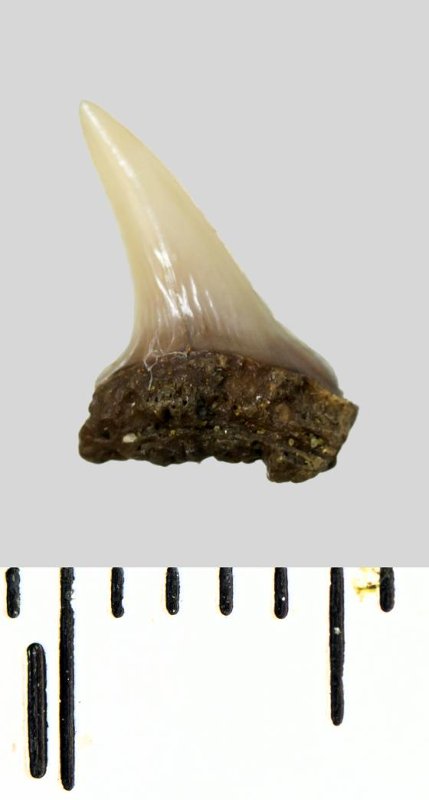 Зуб (фрагмент). Акула. Lamniformes gen. et sp. indet. Классификация: Хордовые Chordata, Позвоночные Vertebrata, Хрящевые рыбы Chondrichthyes, Пластиножаберные Elasmobranchii, Акулы Selachii, Ламнообразные Lamniformes